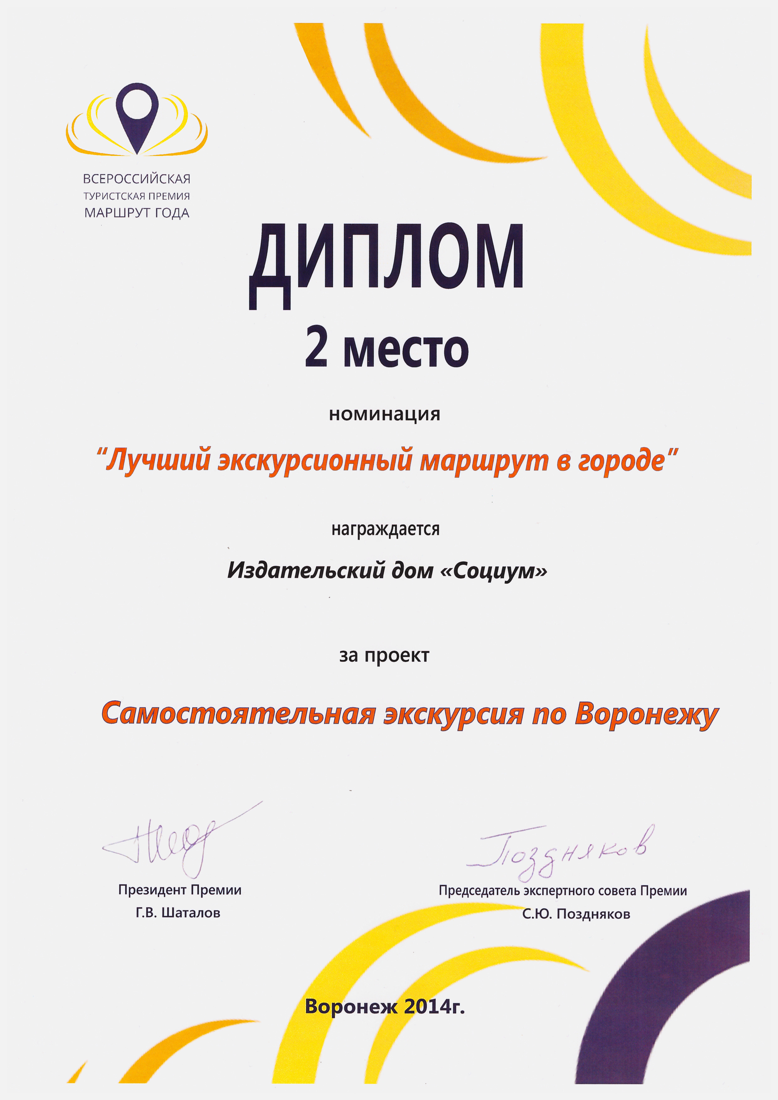 15-16 ноября в Воронеже на территории «АМАКС Парк-отель» прошел финал Всероссийской туристской премии «Маршрут года». В этом году на конкурс проступило 263 проекта из 63 регионов страны, в финальную часть конкурса вышли 134 проекта из 71 населенного пункта, представляющих 42 региона страны. На определение победителей в 17 номинациях у жюри ушло полдня. В каждой номинации жюри определило первое, второе, третье место и гран-при. Издательский дом «Социум» стал лауреатом премии в номинации «Лучший экскурсионный маршрут в городе», заняв второе место с проектом «Самостоятельная экскурсия по Воронежу». Подведение итогов и церемония награждения победителей премии состоялась 16 ноября в ПАБе «Сто Ручьев».